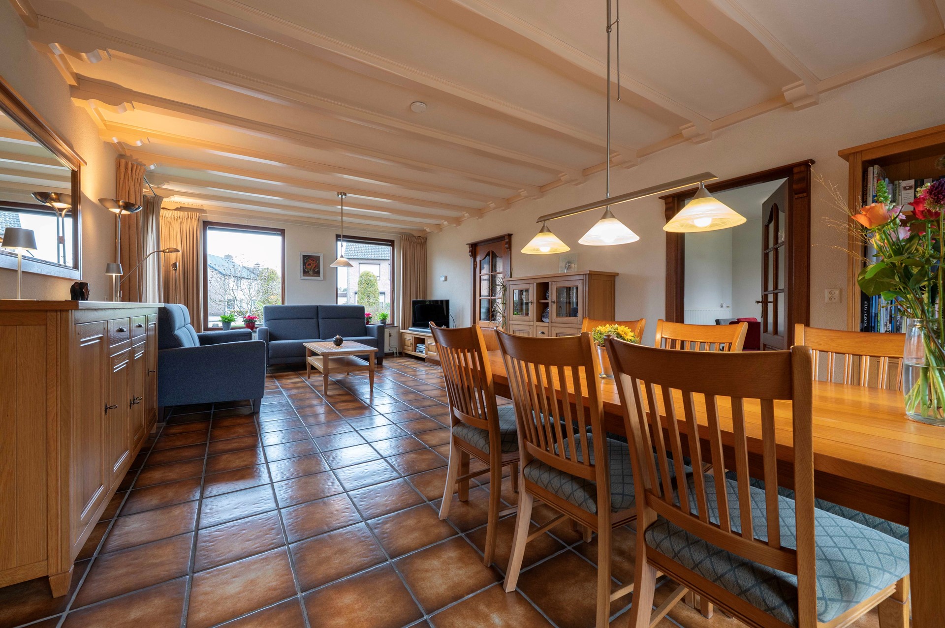 De woonkamer is licht, ruim en sfeervol dankzij het karakteristieke balkenplafond en openslaande tuindeuren die uitkomen op de zonnige achtertuin. Hier kun je heerlijk neerploffen met een boek of gezellig borrelen met vrienden. Dankzij de grote ramen valt er de hele dag veel daglicht naar binnen, wat zorgt voor een prettige, ontspannen sfeer.