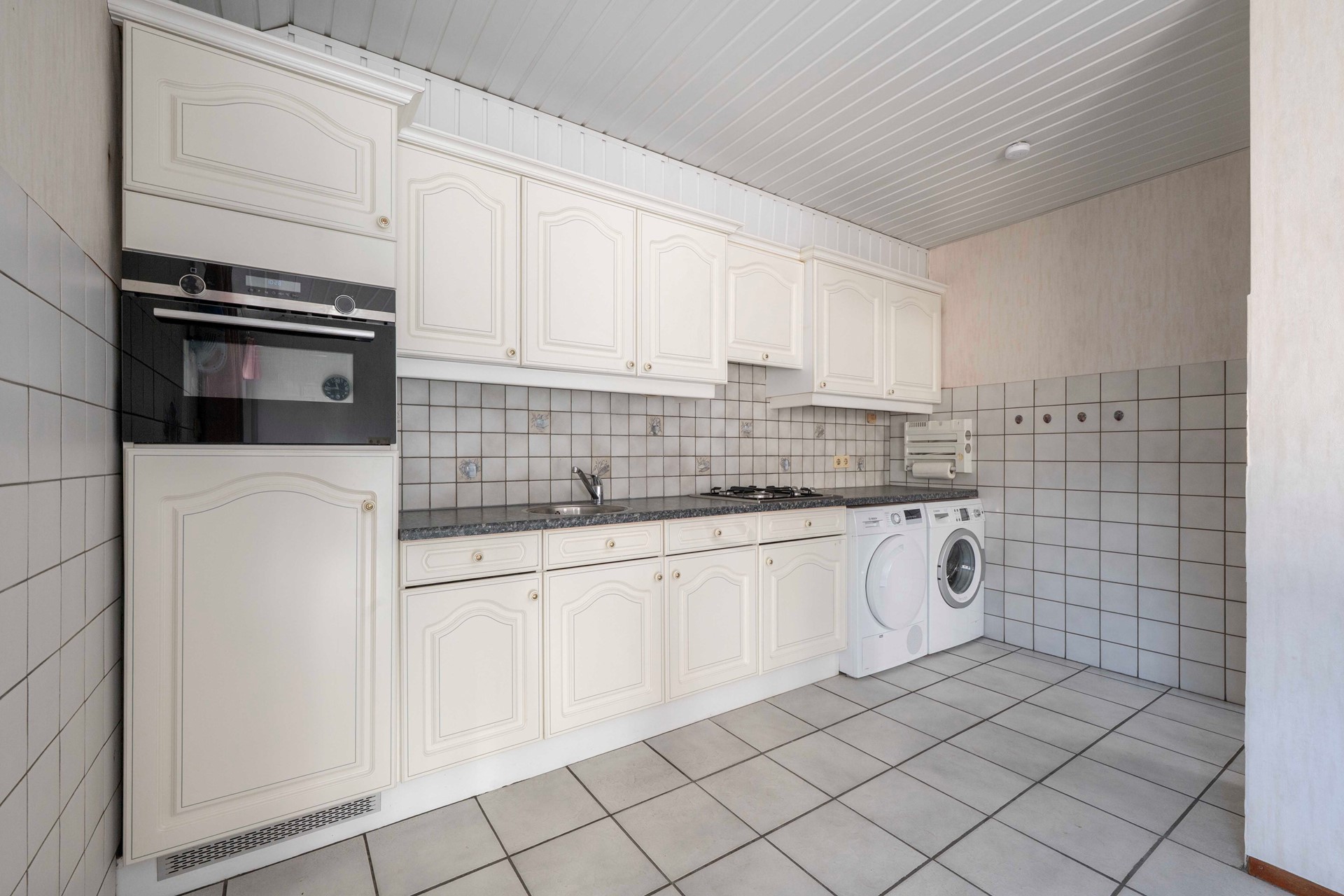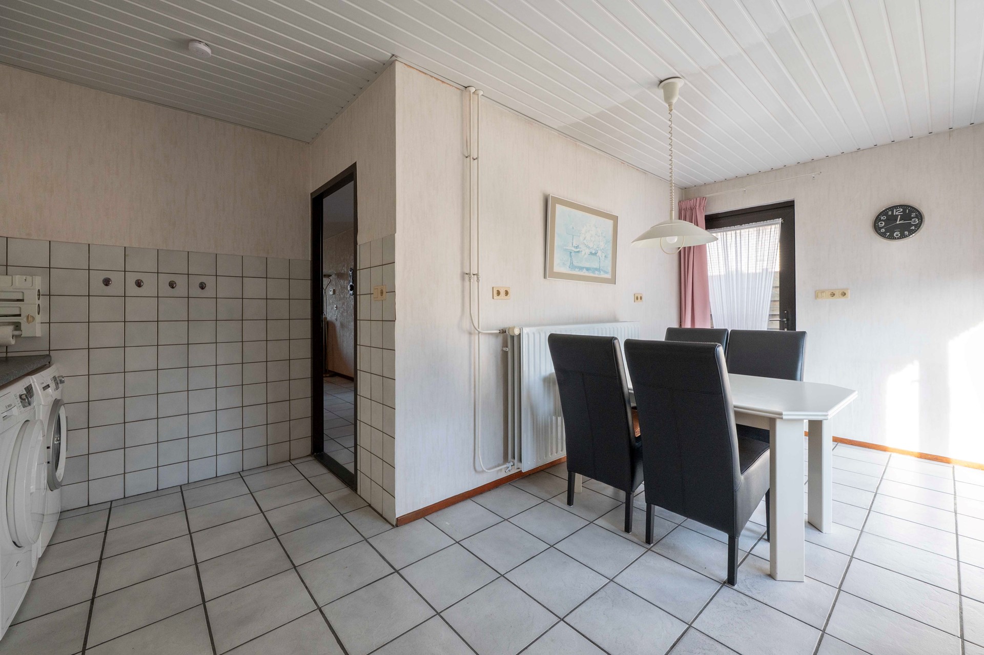 Aan de achterzijde ontdek je de gesloten woonkeuken met uitzicht op de tuin; netjes onderhouden, maar qua sfeer misschien nog een beetje jaren ’80. Ideaal voor iedereen die zin heeft om het helemaal naar eigen smaak (en eisen van nu) te maken! Misschien droom je van een open keuken met een kookeiland, of juist van een knusse eethoek waar het hele gezin samenkomt: het kan hier allemaal!