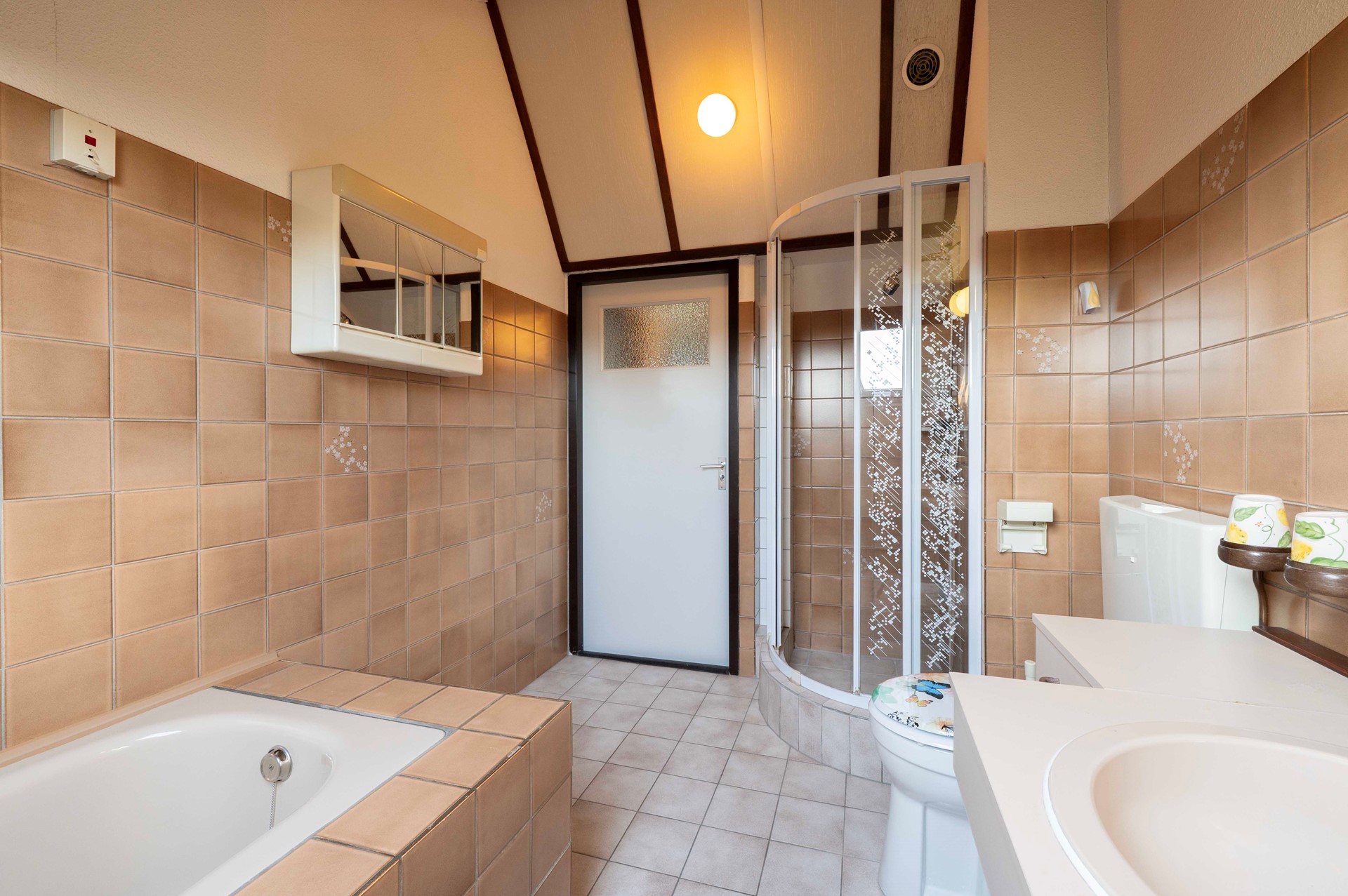 De badkamer is voorzien van een ligbad, douche, toilet en wastafelmeubel. Die oogt wat gedateerd, dus zie het vooral als een mooie gelegenheid om deze ruimte helemaal naar eigen wens te vernieuwen.