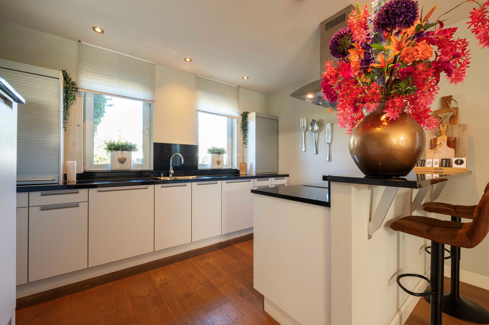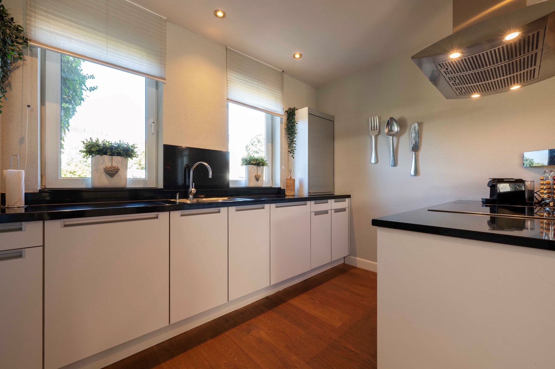 De open keuken ligt aan de de voorzijde. Deze luxe, moderne keuken is werkelijk van alle gemakken voorzien. Hier combineer je moeiteloos koken met gezelligheid: gasten kunnen aanschuiven aan het barretje, terwijl jij de sterren van de hemel kookt.