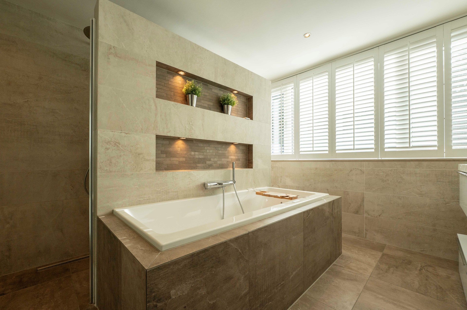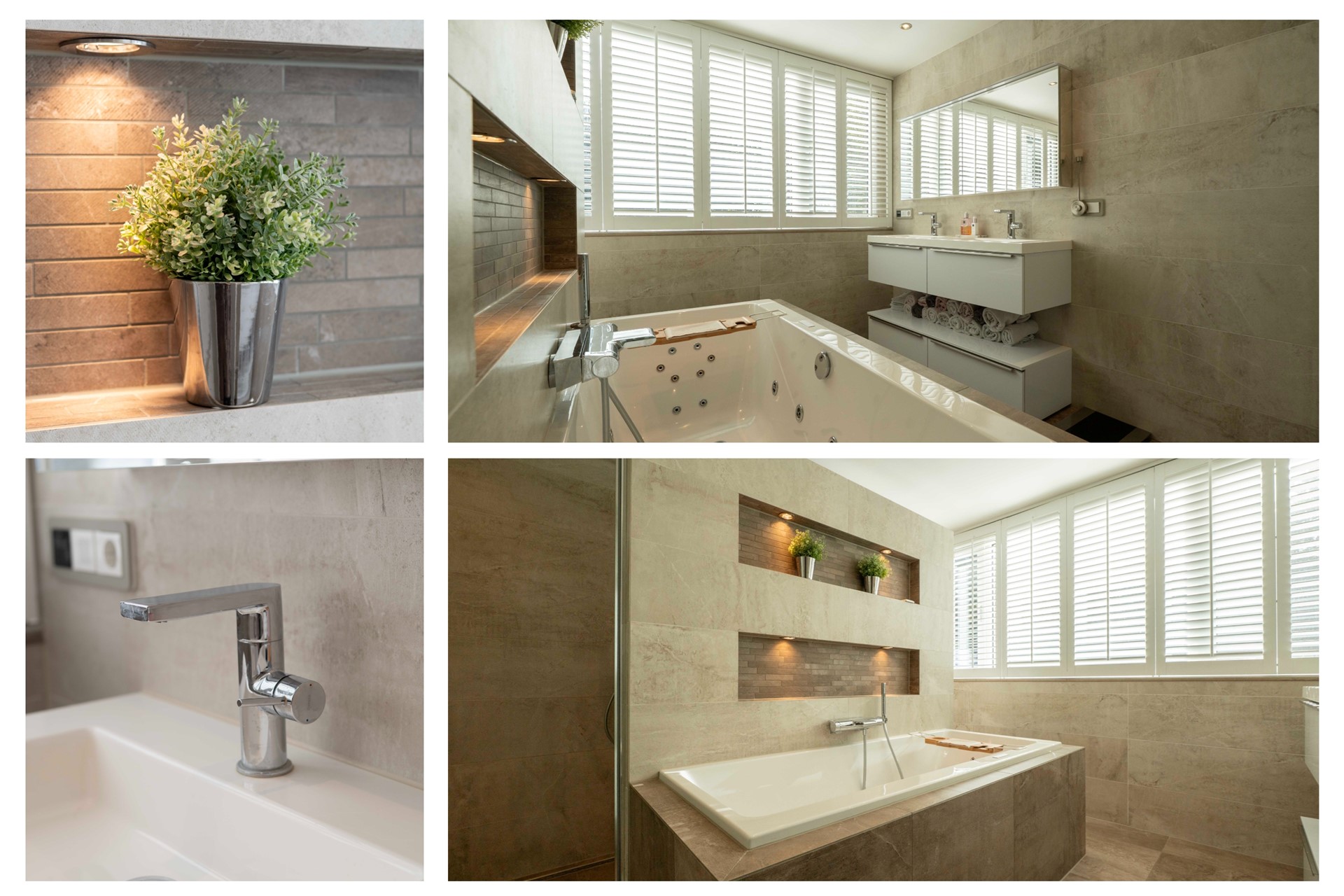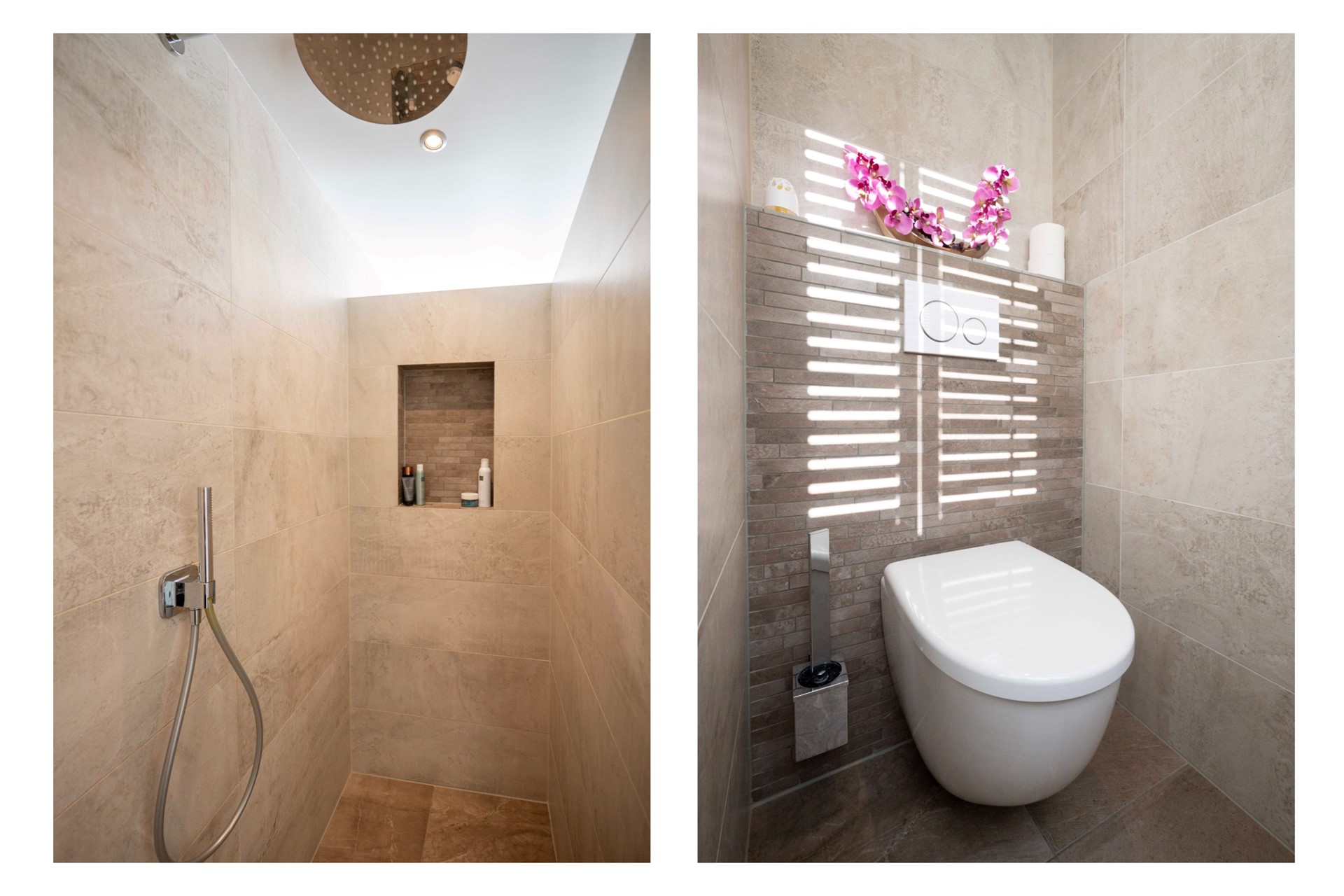 De luxe badkamer is pure verwennerij: een grote inloopdouche, een whirlpool ligbad, mooi wastafelmeubel en toilet, alles in lichte aardetinten. Stylisch, modern en tijdloos.