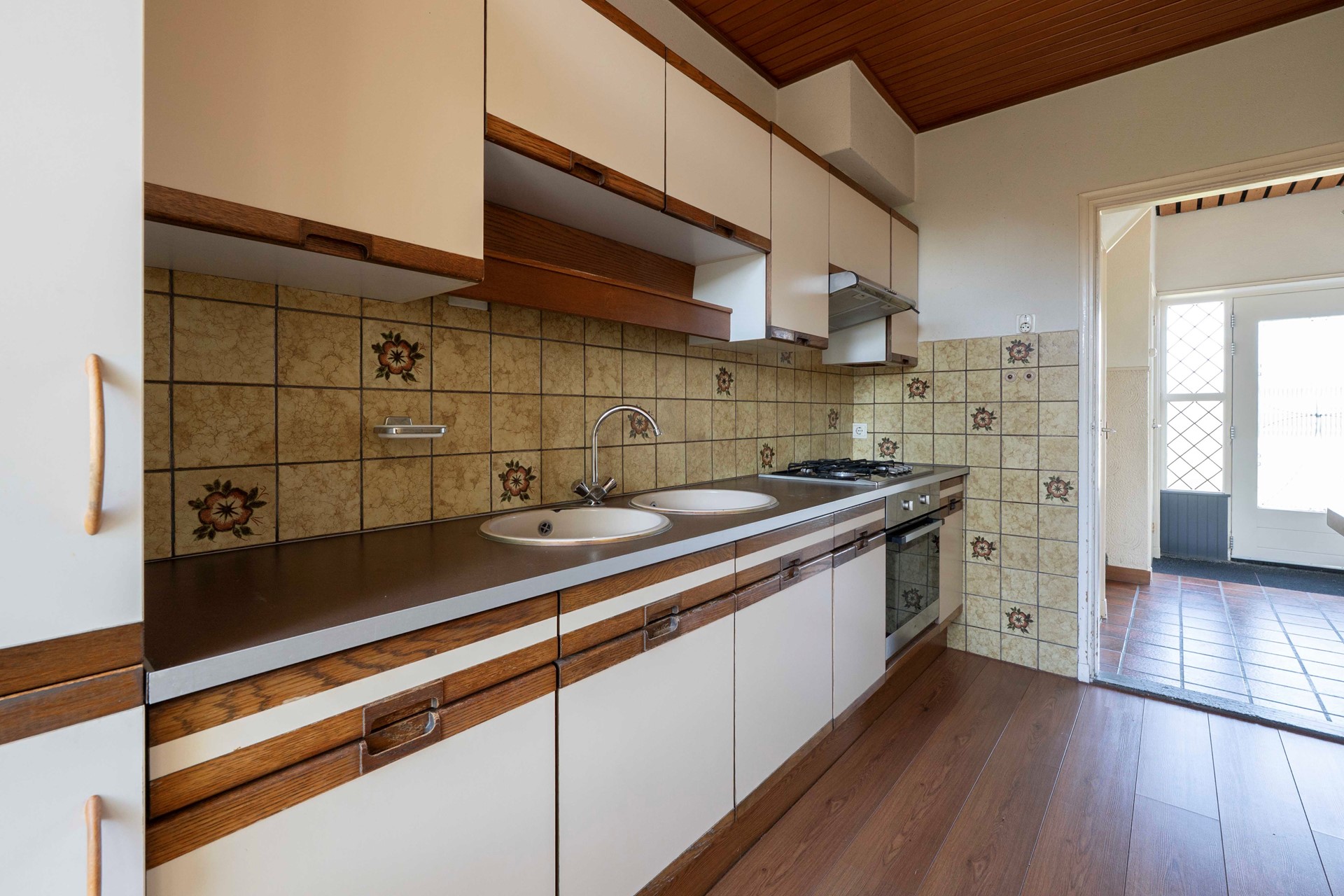 Aan de achterzijde ligt de gesloten keuken. De keuken is inmiddels toe aan vernieuwing. Ideaal dus voor wie zin heeft om zijn of haar droomkeuken te realiseren, eventueel met met realiseren van een directe toegang tot de living.