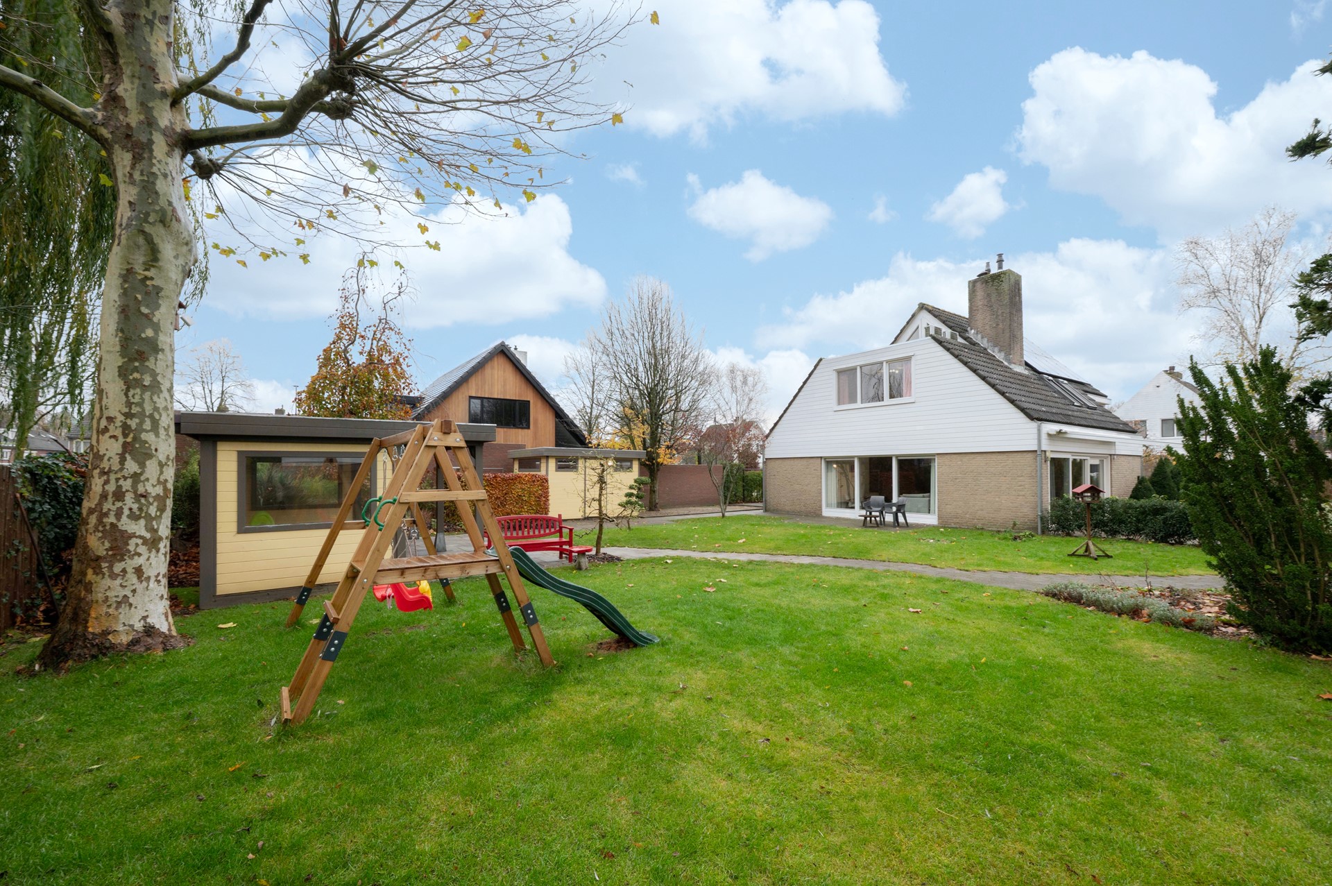 Aan alle kanten wordt de woning omgeven door een prachtig aangelegde tuin. groenrijk, rustig en privé. Van een terras om lekker te loungen, een groot gazon waar kinderen en huisdieren naar hartenlust kunnen spelen, tot volwassen beplanting, een overkapping en een houten berging voor je tuingereedschap. Het is hier op en top genieten.