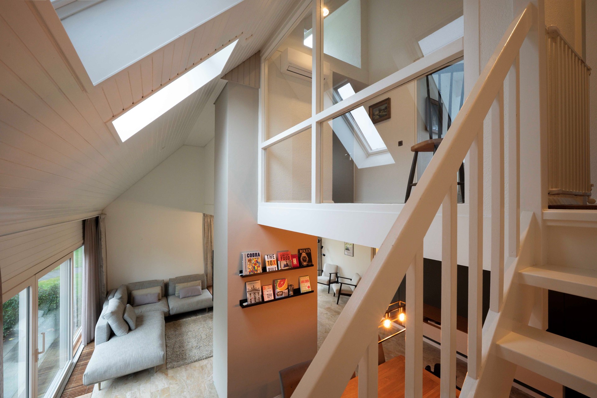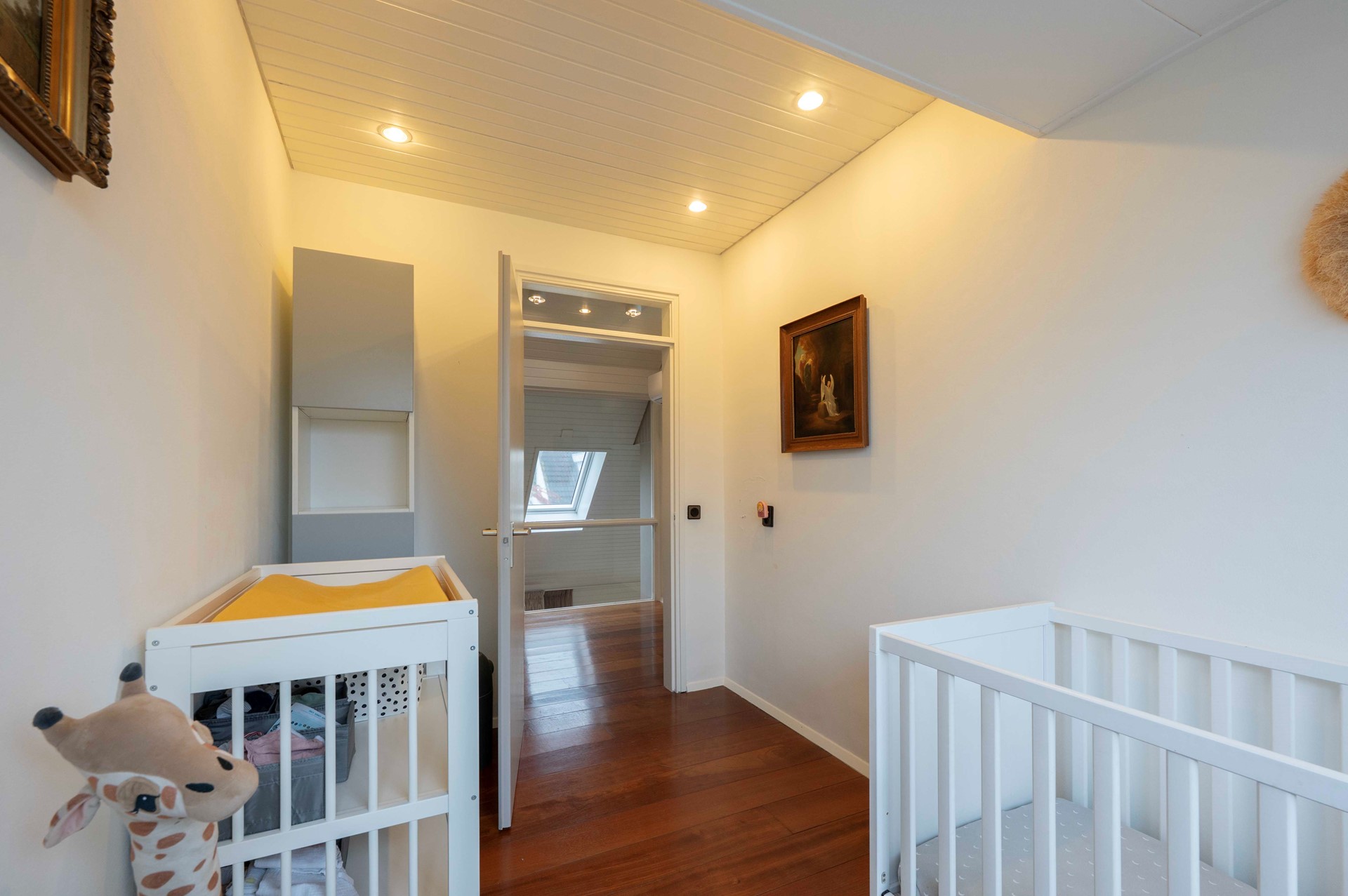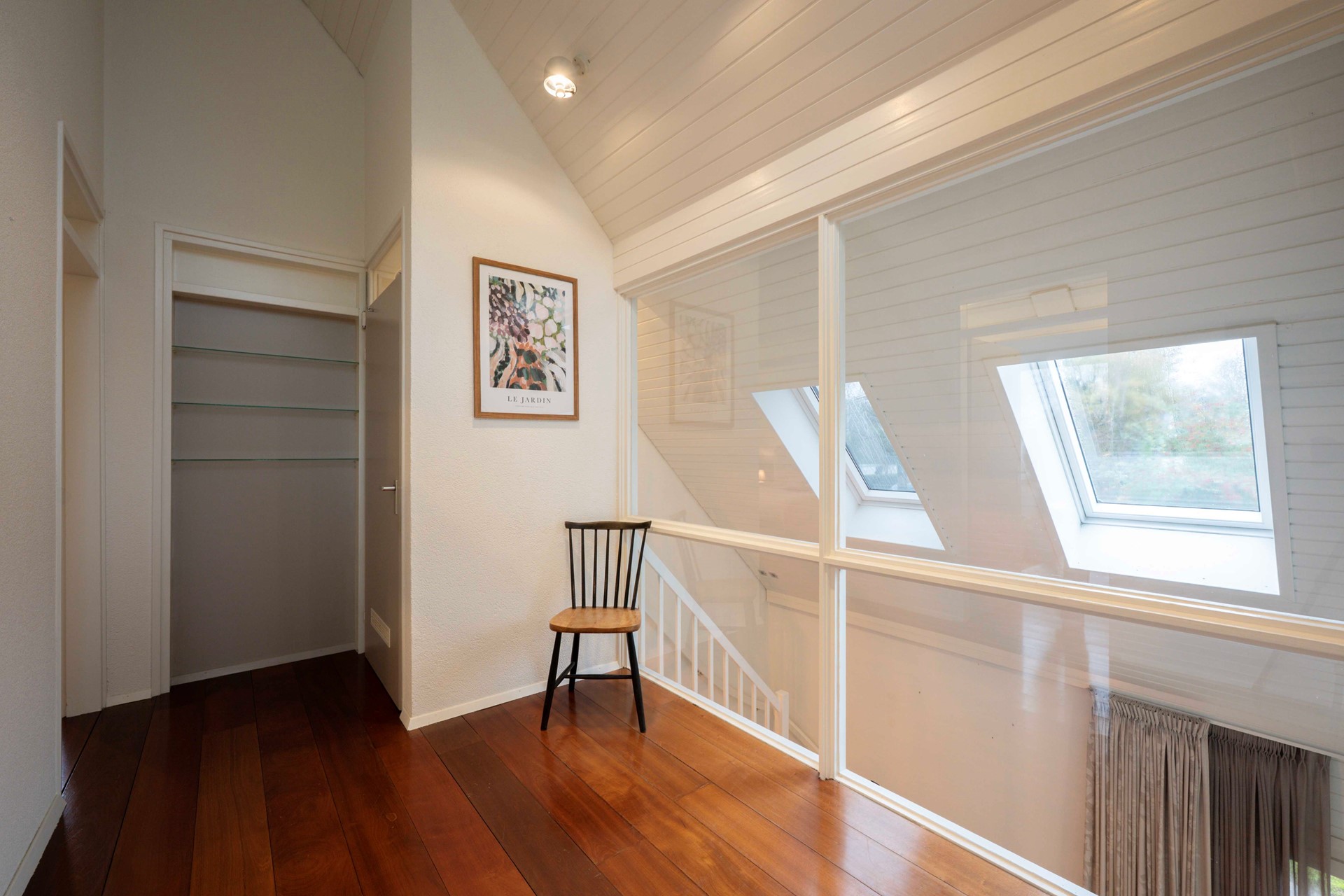 De open trap in de woonkamer leidt naar een uitnodigende vide die de ruimte en hoogte op natuurlijke wijze benadrukt. Op de eerste etage wachten drie lichte slaapkamers. De master bedroom springt eruit met een royale walk-in closet. Vanuit hier kom je via een vlizotrap op de bergzolder, zodat al jouw seizoensspullen makkelijk op te bergen zijn.