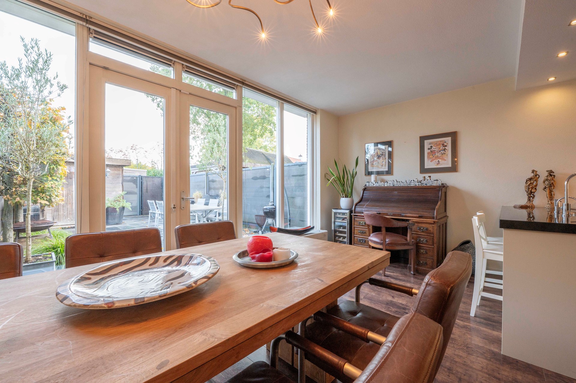 Stap de hal binnen en laat je verrassen door de ruimte die deze woning te bieden heeft. De ruime lichte woonkamer vormt het hart van het huis. Dankzij de uitbouw aan de achterzijde is er opvallend veel leefruimte ontstaan, met volop plek voor een grote eettafel, knusse zithoek en zelfs een speelplekje voor de kinderen. Openslaande tuindeuren verbinden binnen moeiteloos met buiten. Op zomerse dagen zet je alles open en loopt iedereen zo de tuin in.