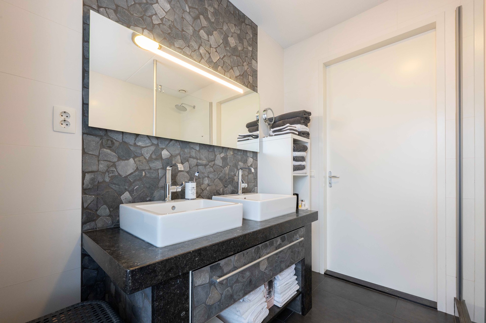 De badkamer is volledig betegeld, uitgevoerd in neutrale tinten en ingericht met een inloopdouche, een tweede toilet en een dubbel wastafelmeubel waardoor niemand hier lang op zijn beurt hoeft te wachten.