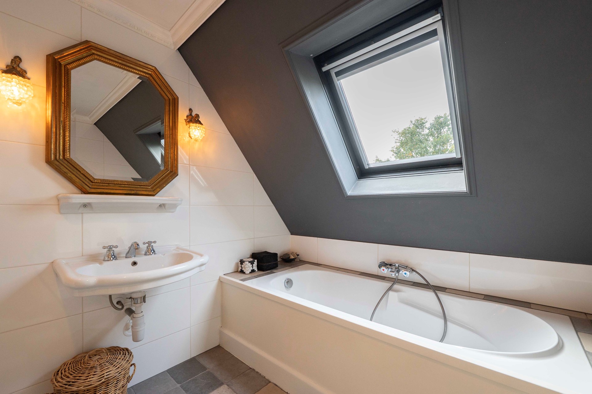 De tweede badkamer op deze verdieping is compleet met ligbad, wastafel en toilet – ideaal voor drukke ochtenden of een ontspannen bad na een lange dag.