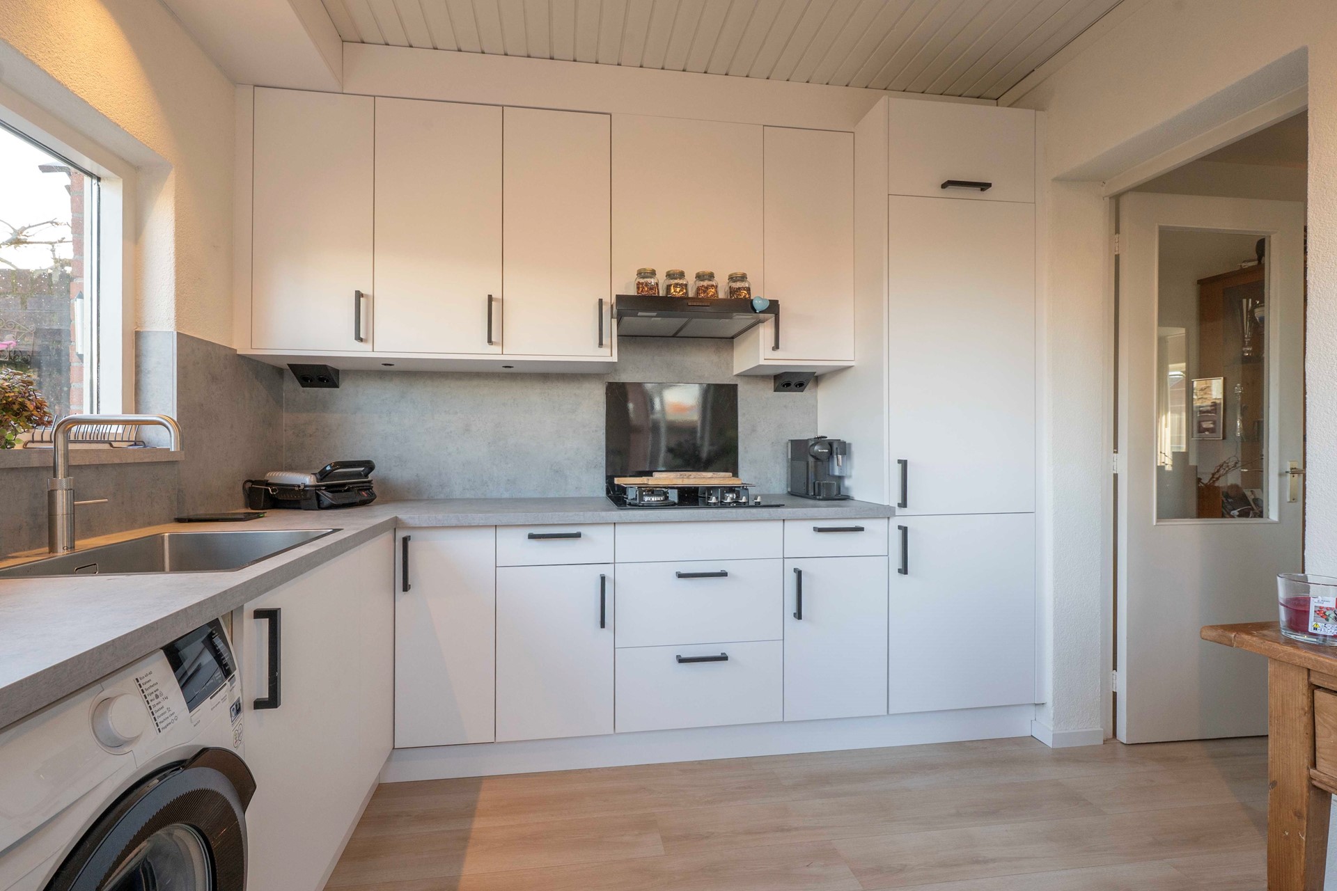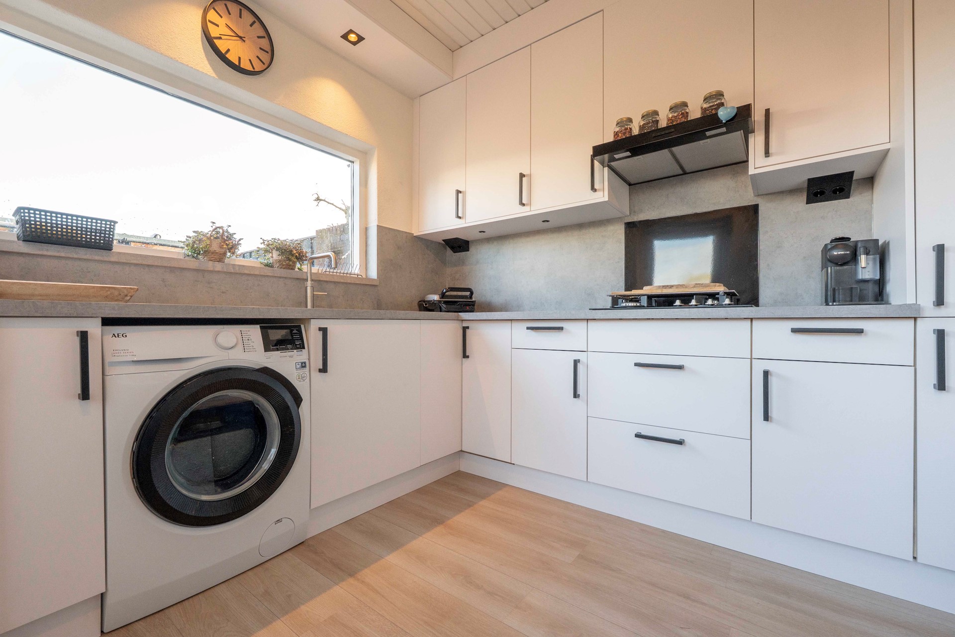 Aan de achterzijde vind je de gesloten keuken. Het werkblad is groot, met veel kastruimte, ideaal voor beginnende én gevorderde koks. Dankzij de moderne afwerking hoef je niet meer aan de slag met potten verf of nieuwe kastjes; je kunt hier direct jouw favoriete recepten tot leven brengen. Via de keuken heb je trouwens direct toegang tot de tuin, handig, want op zomerse dagen leef je natuurlijk net zo lief buiten als binnen.