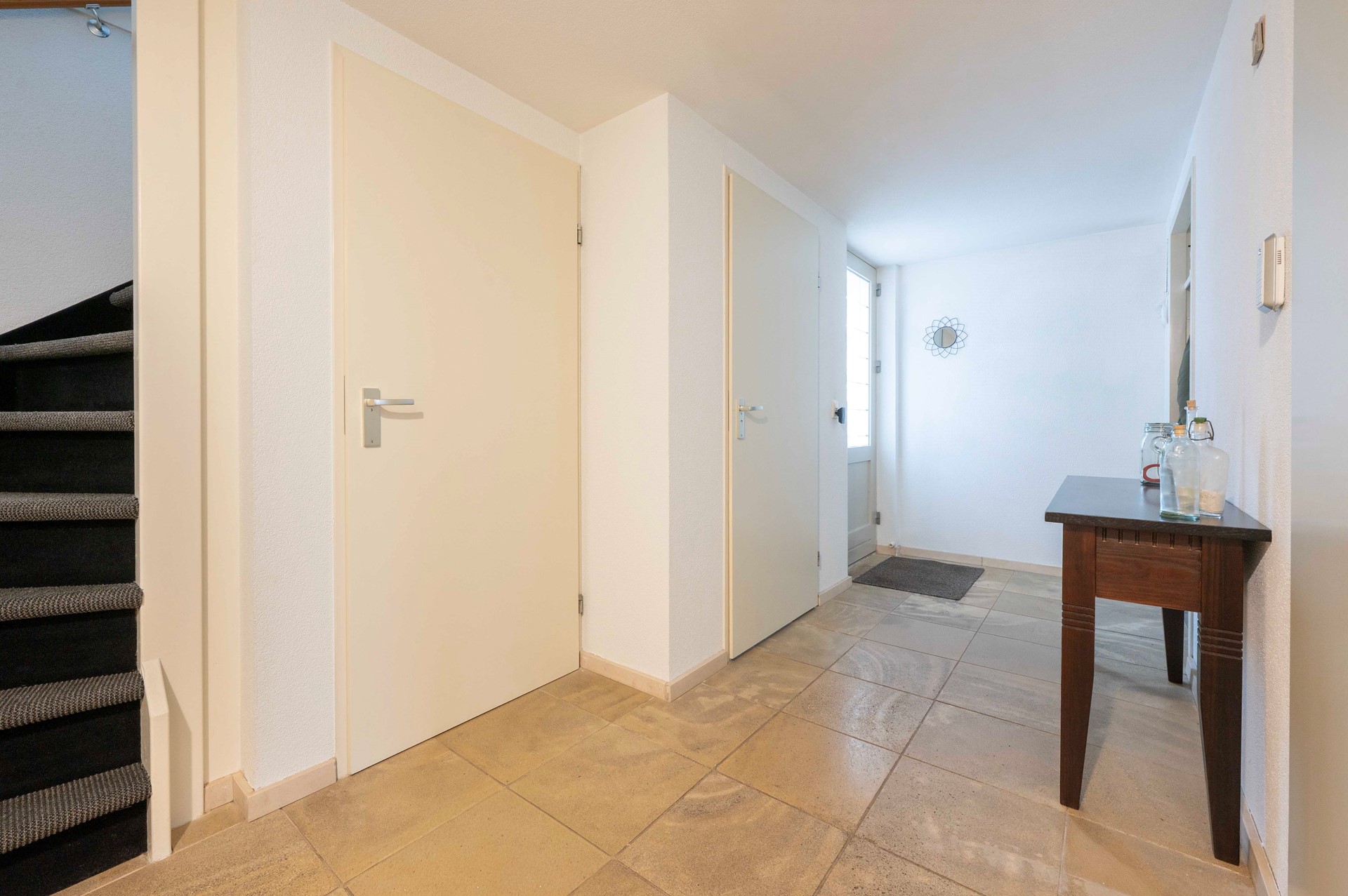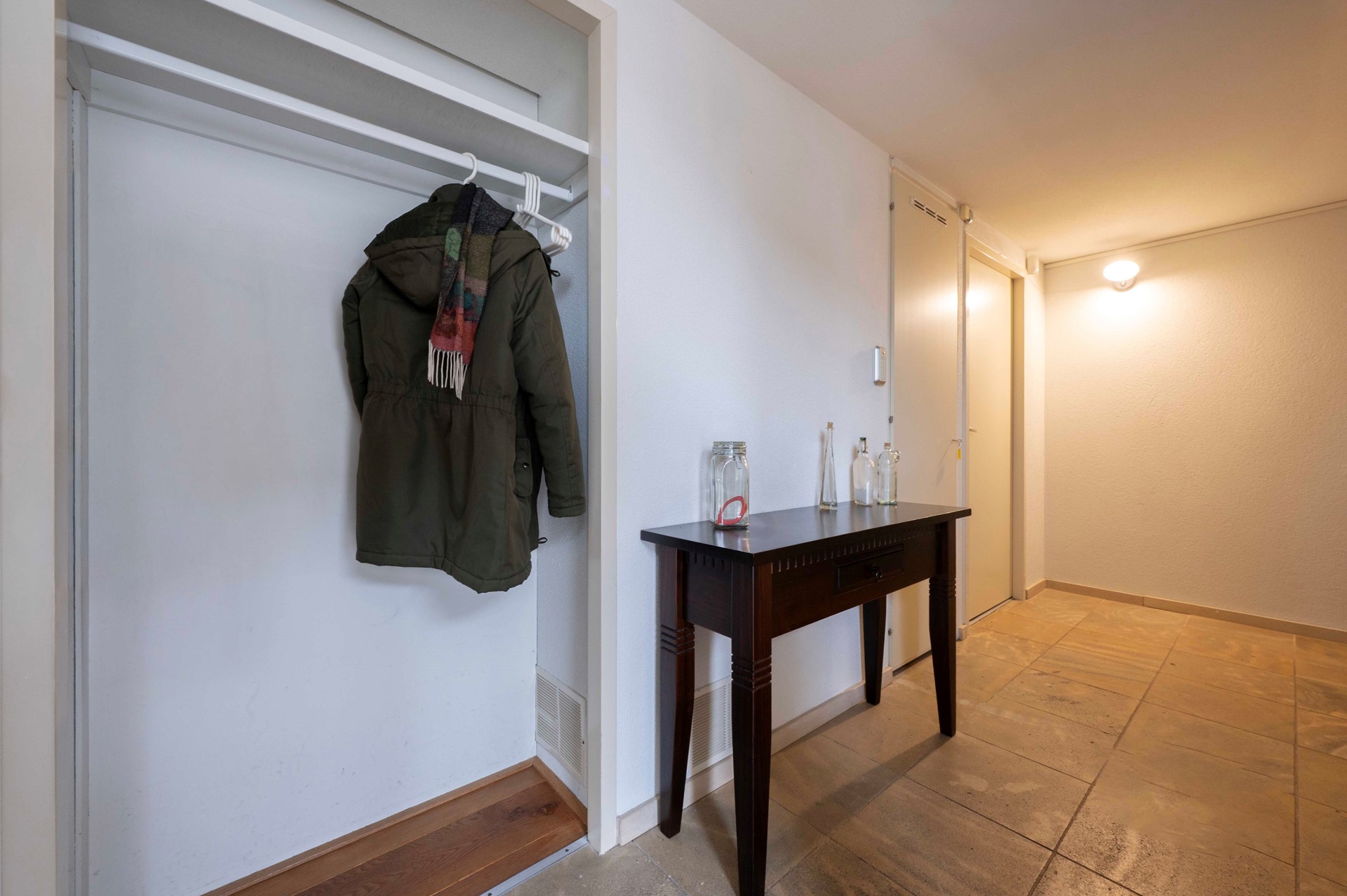 Stap binnen in de hal, waar je naast het toilet en de trapopgang, ook een handige voorraadkast vindt.