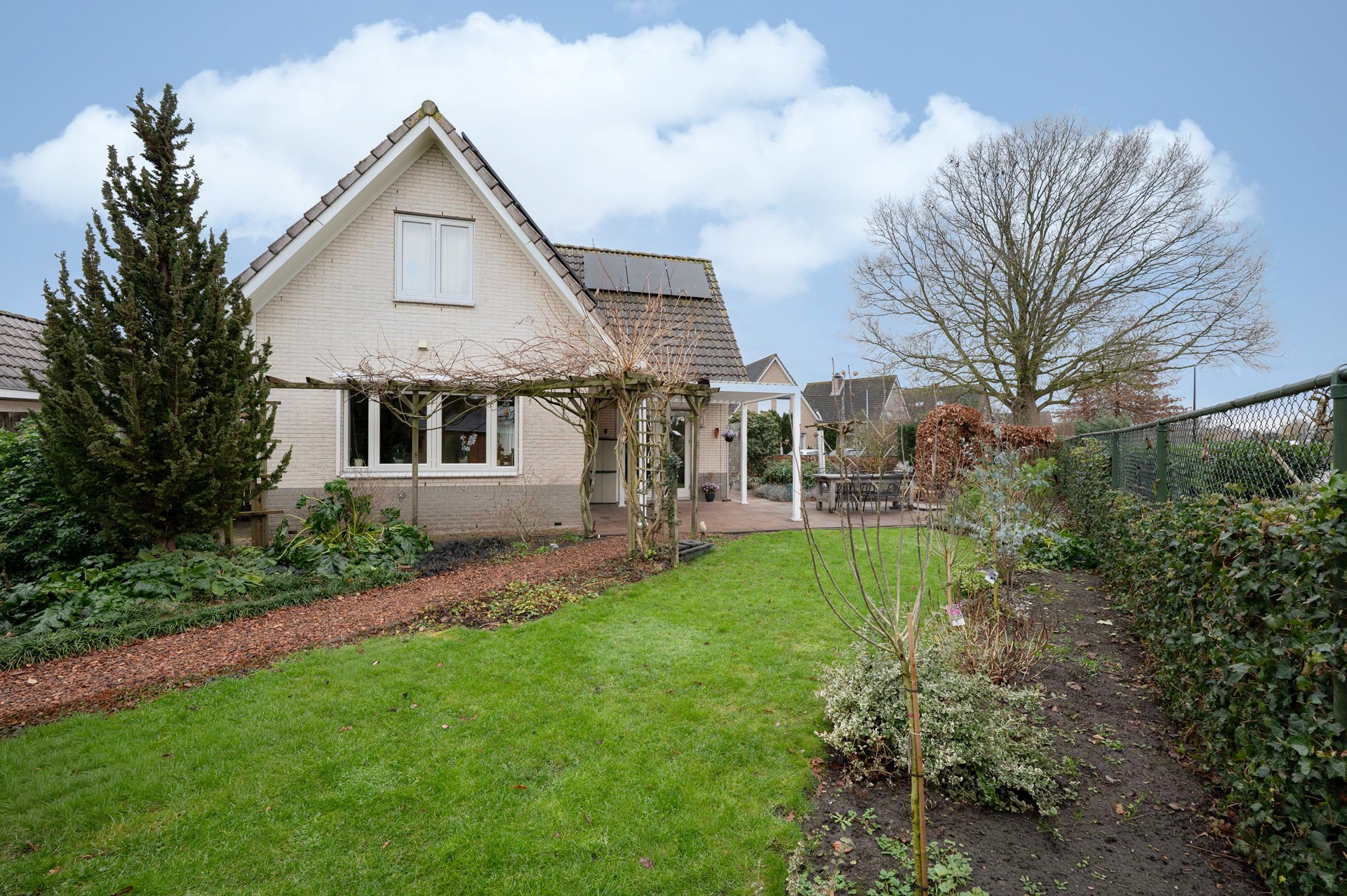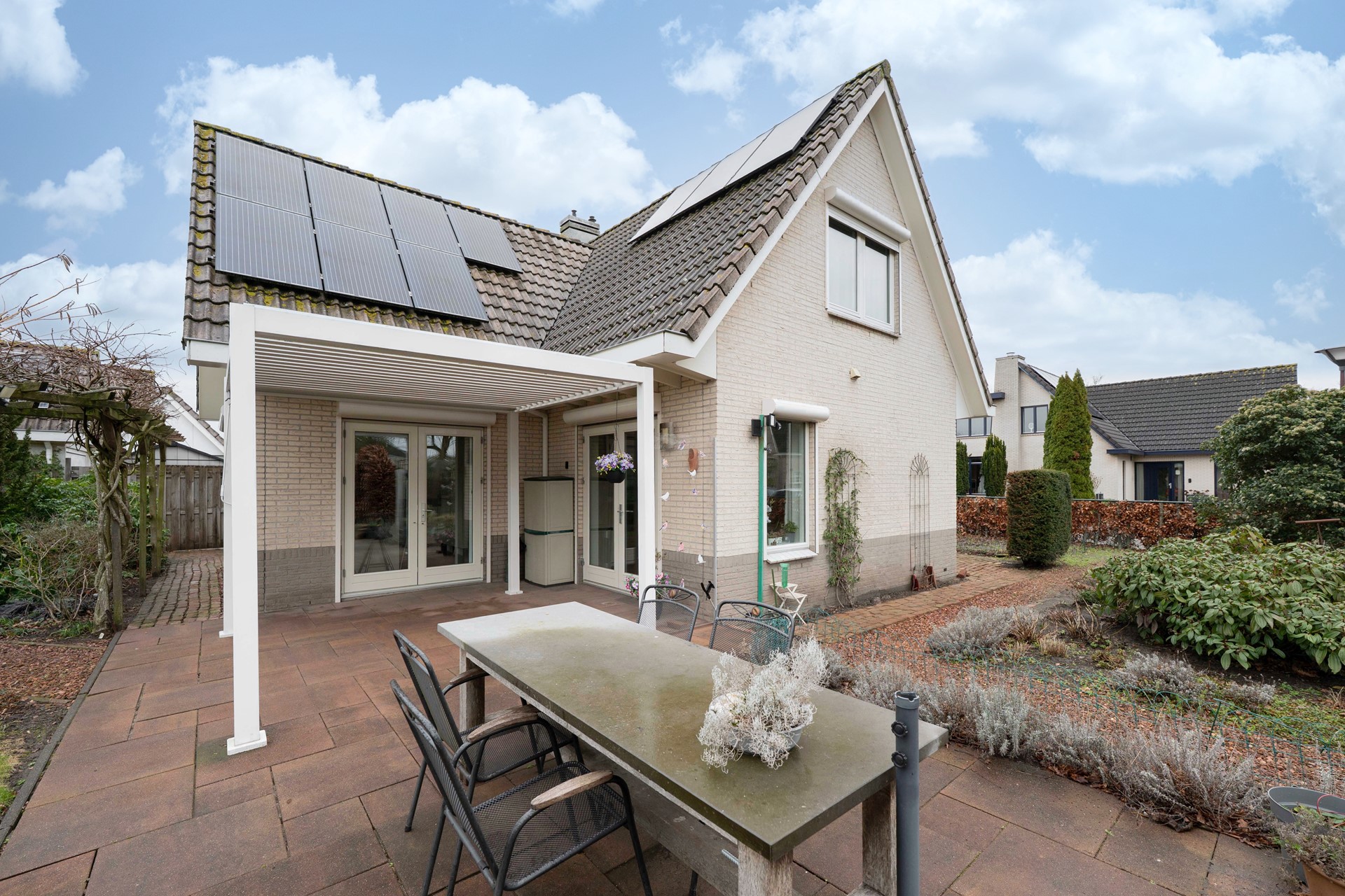 Ook buiten is het volop genieten. Rondom de hele woning tref je een fraai aangelegde, groene tuin met een groot terras, gazon en speelse hoekjes. Een deel is zelfs voorzien van een gezellige overkapping; ideaal voor buiten tafelen, ook als het weer even niet meewerkt.