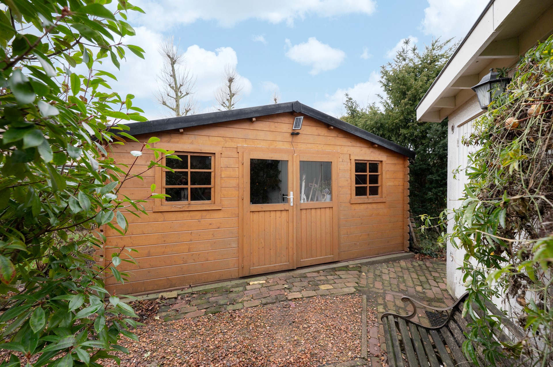 De vrijstaande houten berging en de garage zorgen bovendien voor volop praktische bergruimte, of je nu fietsen, tuinspullen of hobby’s kwijt wil.
