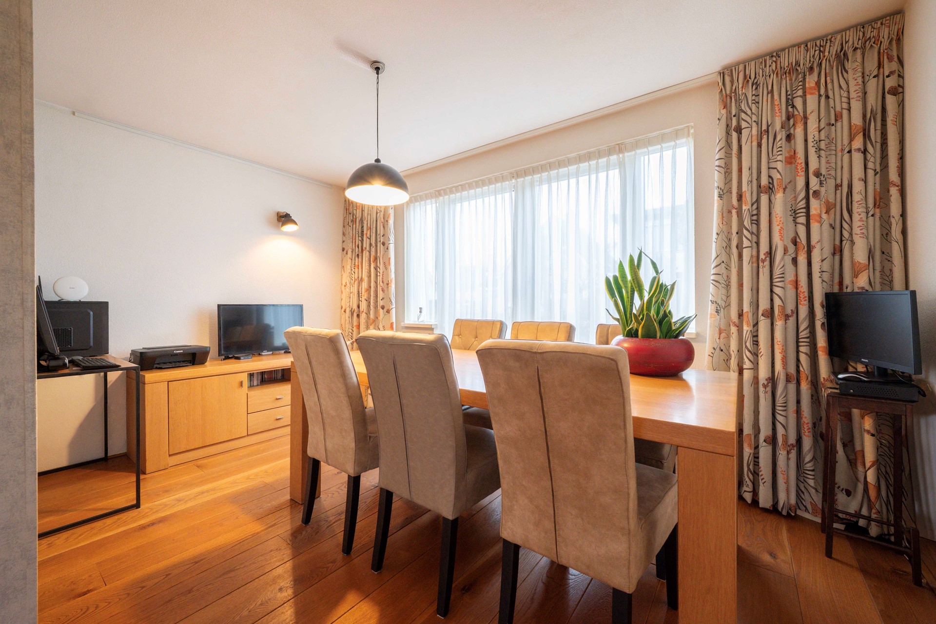Loop verder en je komt in de royale woonkamer terecht. Dankzij de flinke raampartijen schijnt het daglicht hier gul naar binnen, wat zorgt voor een uitnodigende en ontspannen sfeer. De vrij indeelbare ruimte is voorzien van een prachtige houten vloer en biedt tal van mogelijkheden: een gezellige zithoek bij het raam, een speelplekje voor de kids, misschien zelfs een fijne thuiswerkplek; jij kiest! Hier ervaar je echt het ultieme wooncomfort.