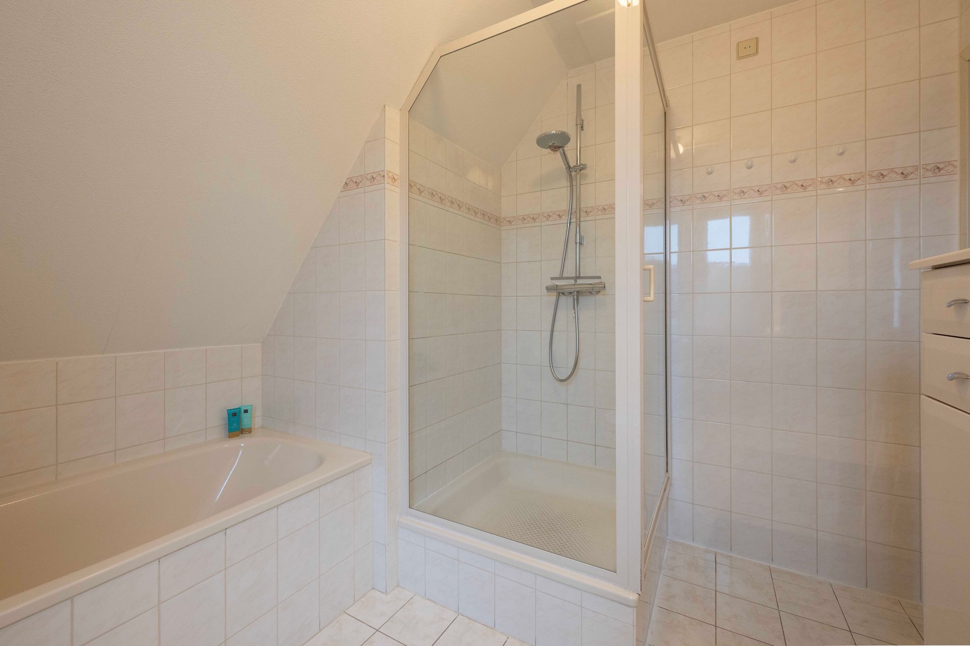 De badkamer is compleet uitgerust met een ligbad, aparte douche, wastafelmeubel en een tweede toilet. Mocht je dromen van jouw ideale spa, dan biedt deze ruimte genoeg mogelijkheden om een droombadkamer te realiseren.