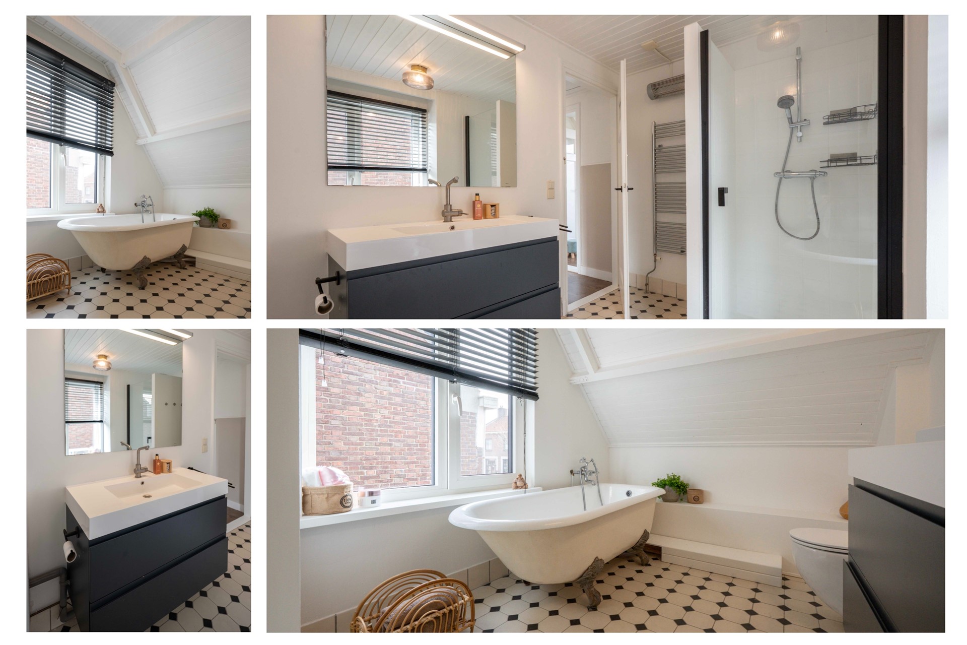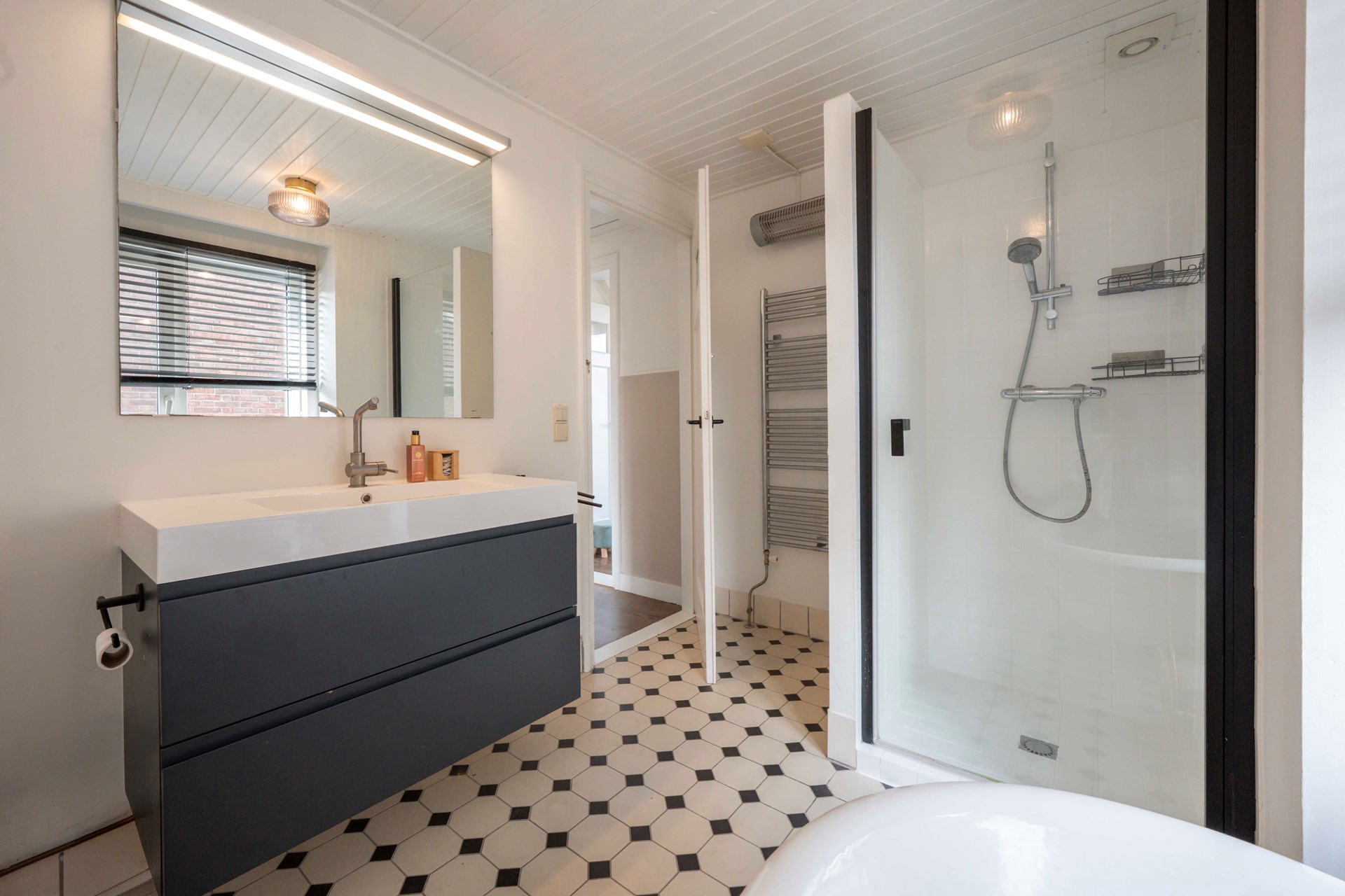 De badkamervoorzieningen mogen er wezen: een sfeervol ingerichte badkamer uitgerust met ligbad, douche, wastafel en toilet; ideaal voor het hele gezin.