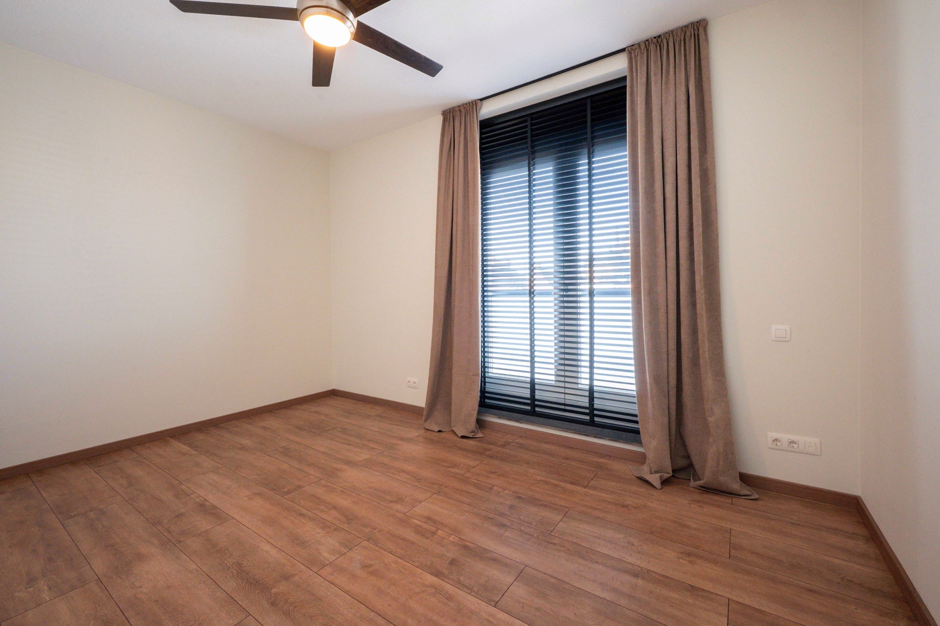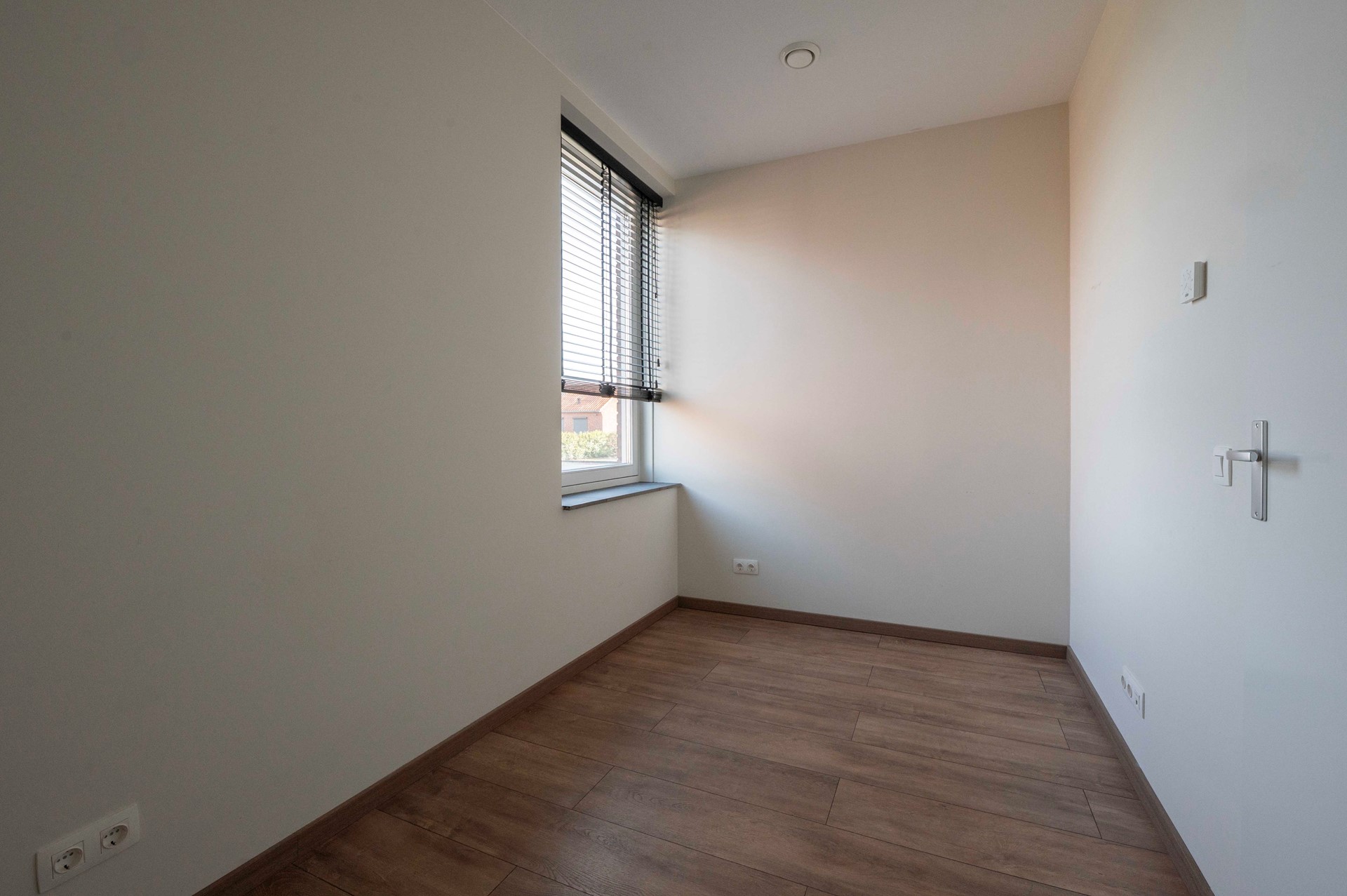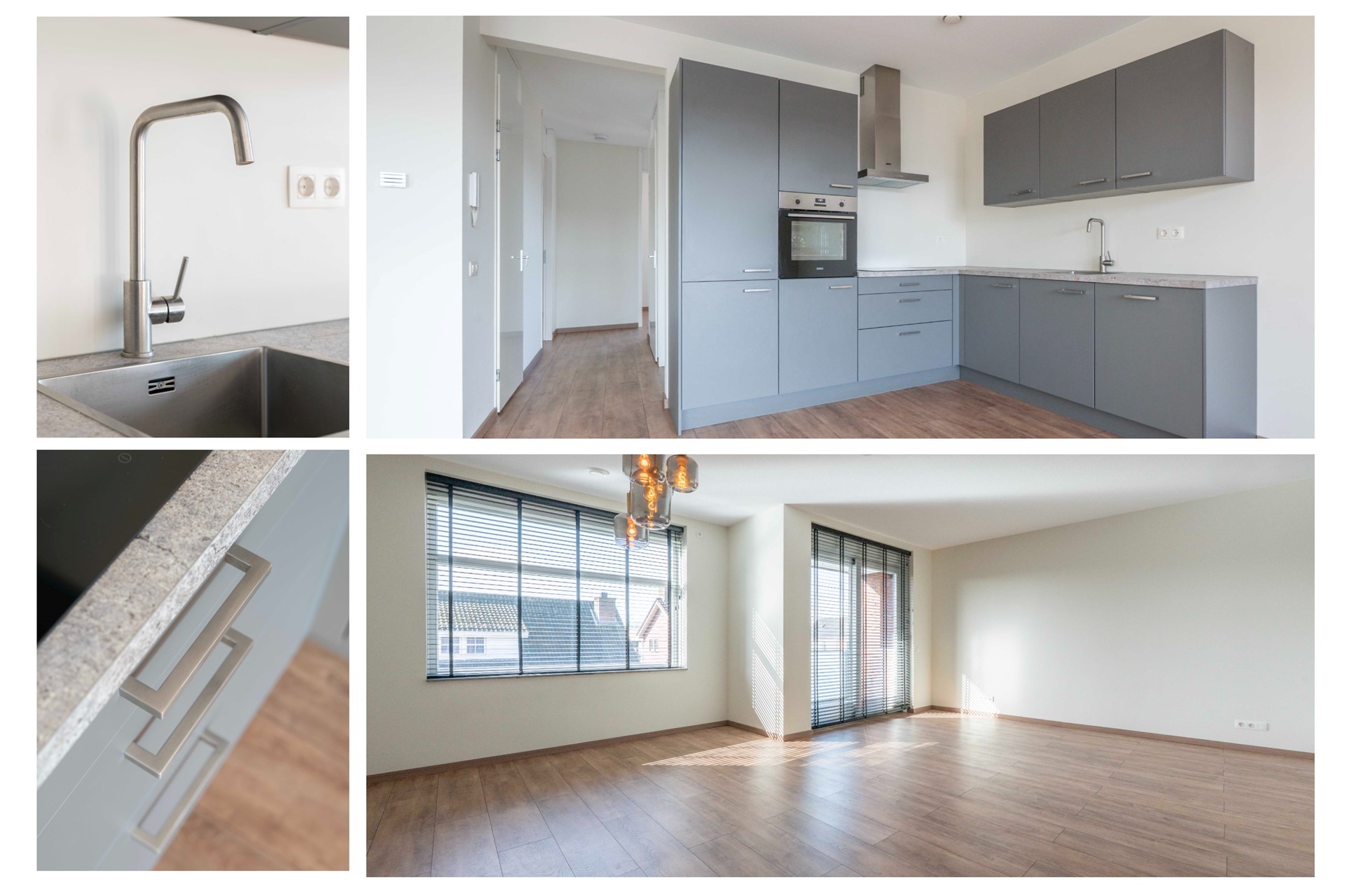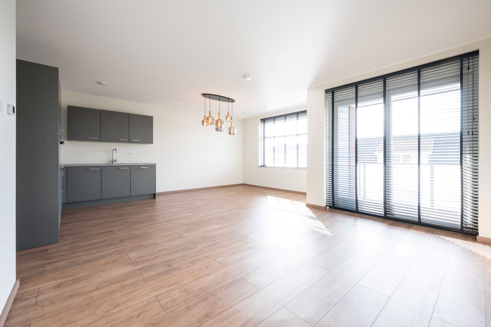 Aangrenzend vind je de moderne open keuken, van alle gemakken voorzien. Of je nu kookliefhebber bent of snel iets op tafel wilt zetten, hier kan het allemaal. De neutrale kleurstelling, gestucte wanden en stijlvolle laminaatvloer maken dat je direct sfeer creëert met je eigen meubels en smaak.
