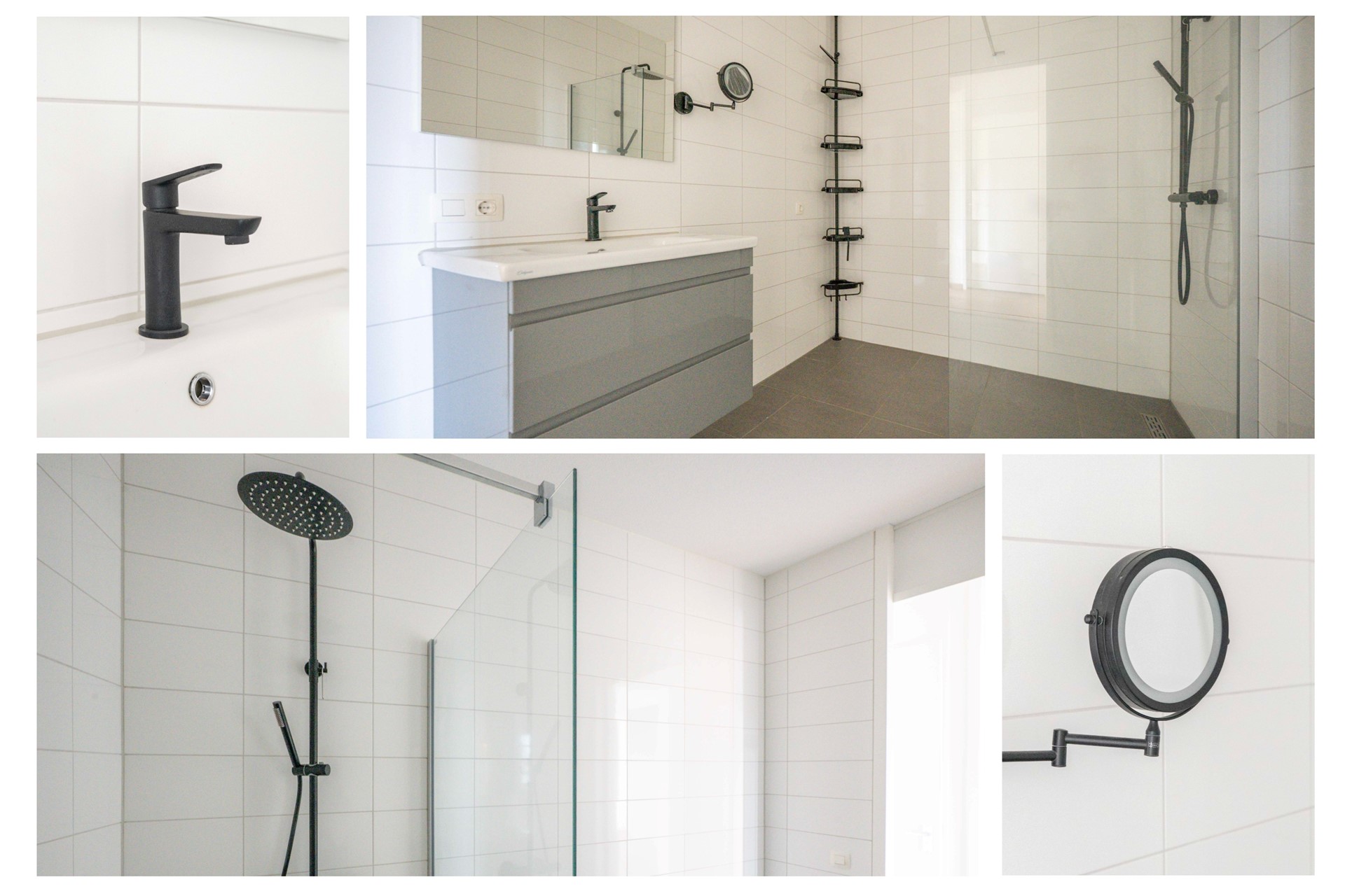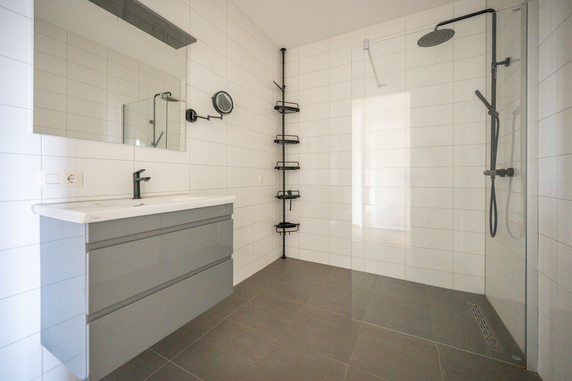 De badkamer oogt modern en fris en is voorzien van een grote inloopdouche en een modern wastafelmeubel.