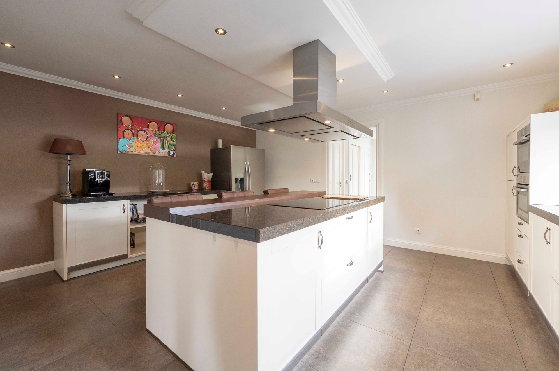 Via prachtige ensuitedeuren loop je door naar de royale, afgesloten woonkeuken. Koken wordt in deze keuken echt een feestje. Je beschikt over een royaal kookeiland met bar (perfect voor ontbijtjes of goede gesprekken), moderne inbouwapparatuur én directe toegang tot de kelder – praktisch en stijlvol. Geen wens blijft hier onvervuld; het geheel ademt kwaliteit en luxe.