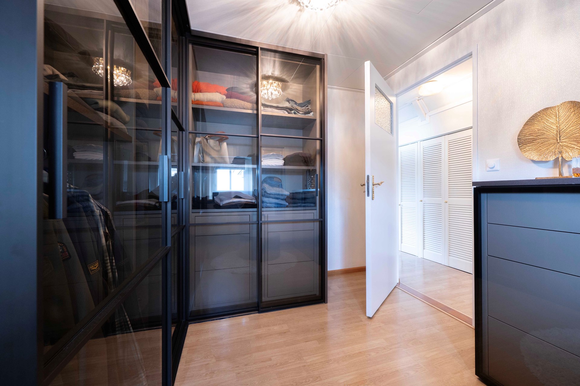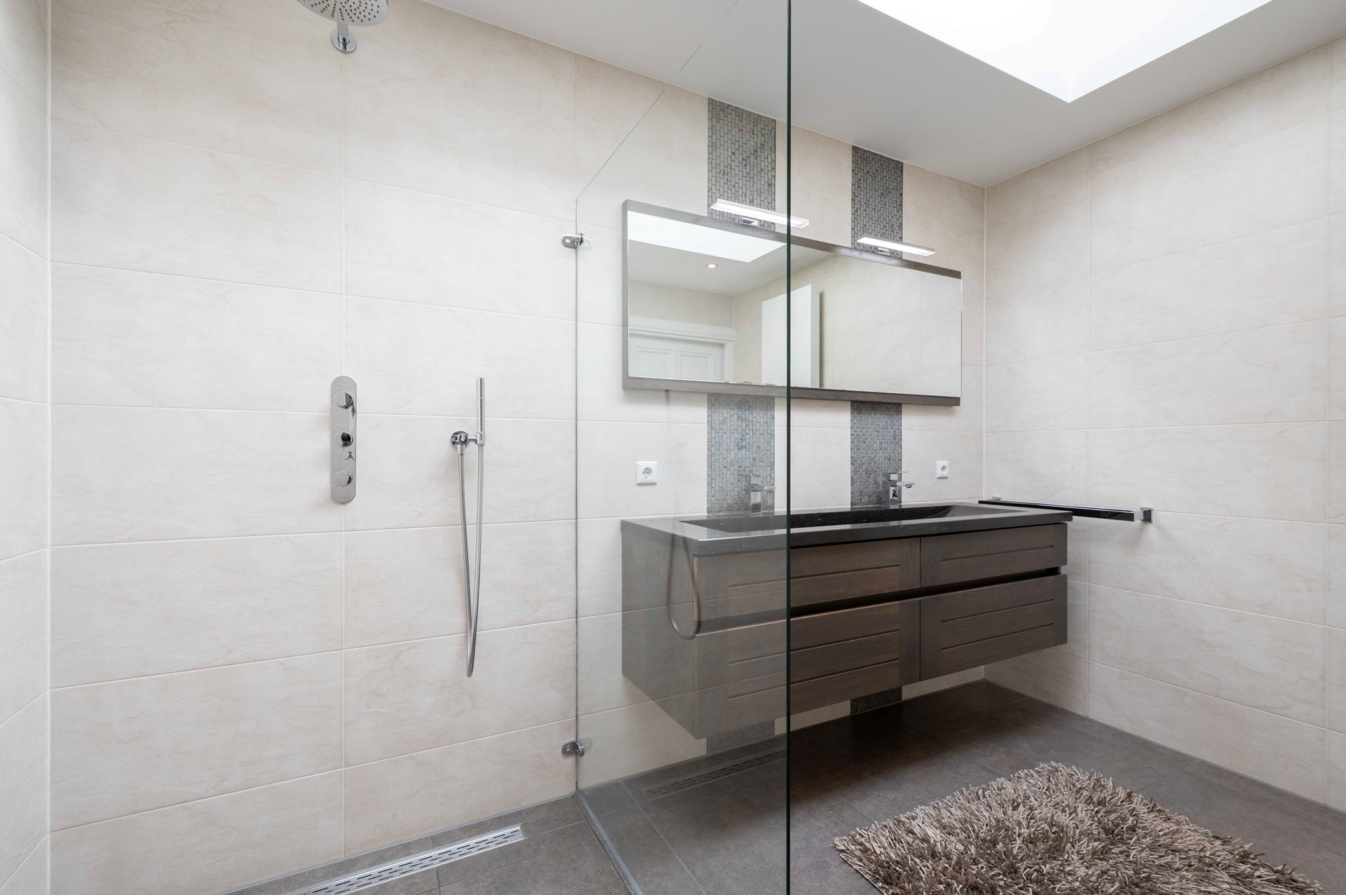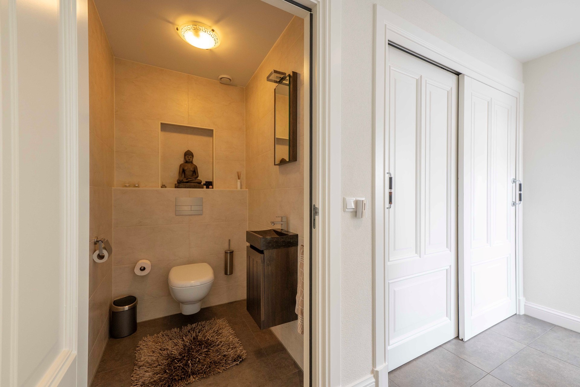 De luxe badkamer laat niets te wensen over: een riante inloopdouche, dubbele wastafel en maatwerk kasten voor al je handdoeken en toiletspullen, slim af te sluiten met moderne glazen deuren. Voor extra gemak is er een separaat toilet.