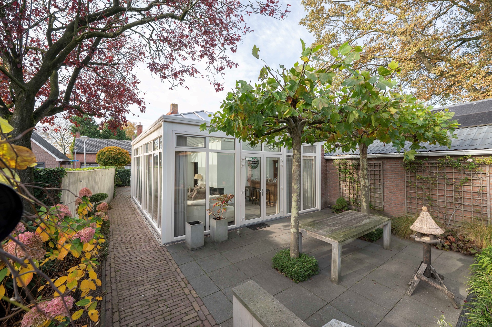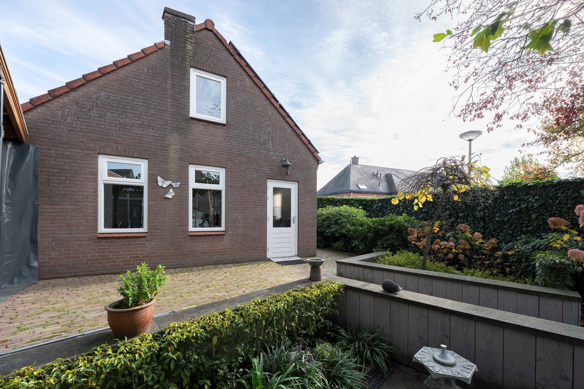 Achter de woning ontvouwt zich een fraaie, besloten tuin. Hier kun je spelen, barbecueën, loungen of simpelweg genieten van de rust. Achter in de tuin vind je een praktische schuur en een garage met overkapping. Ruimte genoeg dus, voor hobby’s, fietsen of die oldtimer die eindelijk droog geparkeerd kan worden.