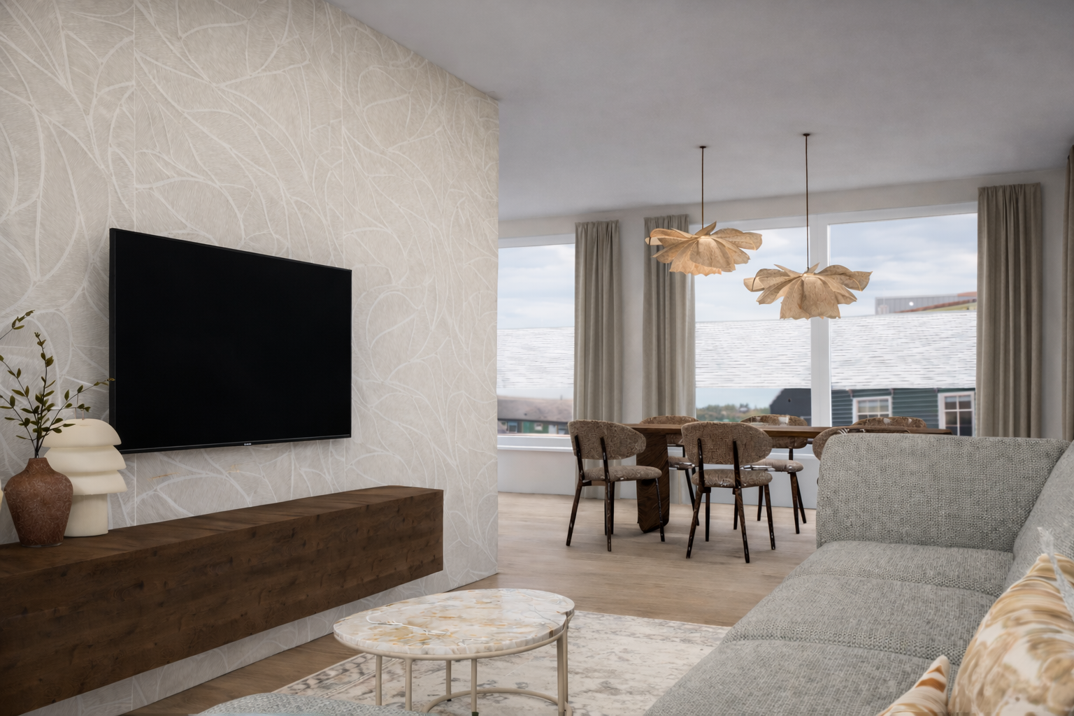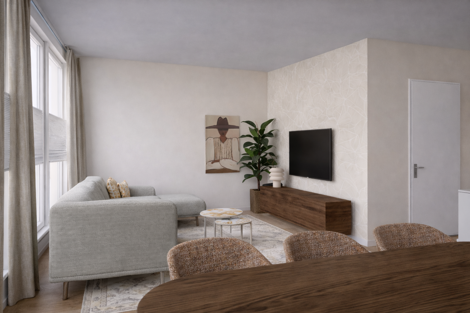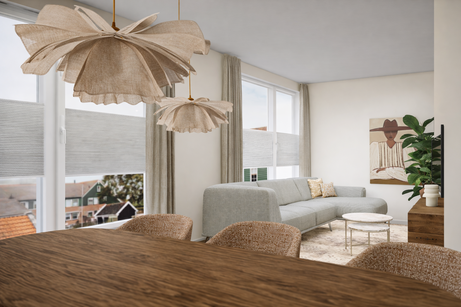 De ruime woonkamer is zeer licht door een viertal grote raampartijen.
