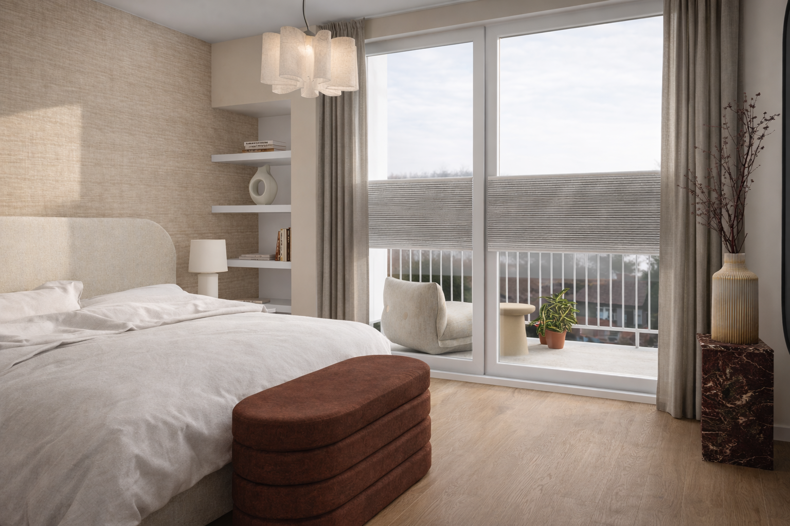 Het appartement beschikt over drie volwaardige slaapkamers. Twee daarvan liggen aan de achterzijde en bieden directe toegang tot het balkon, ideaal voor een moment in de buitenlucht.